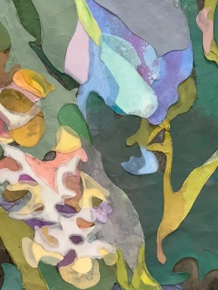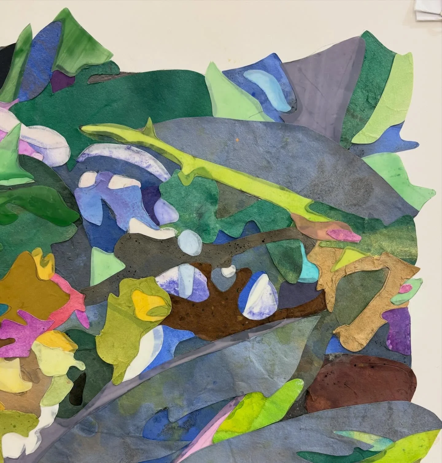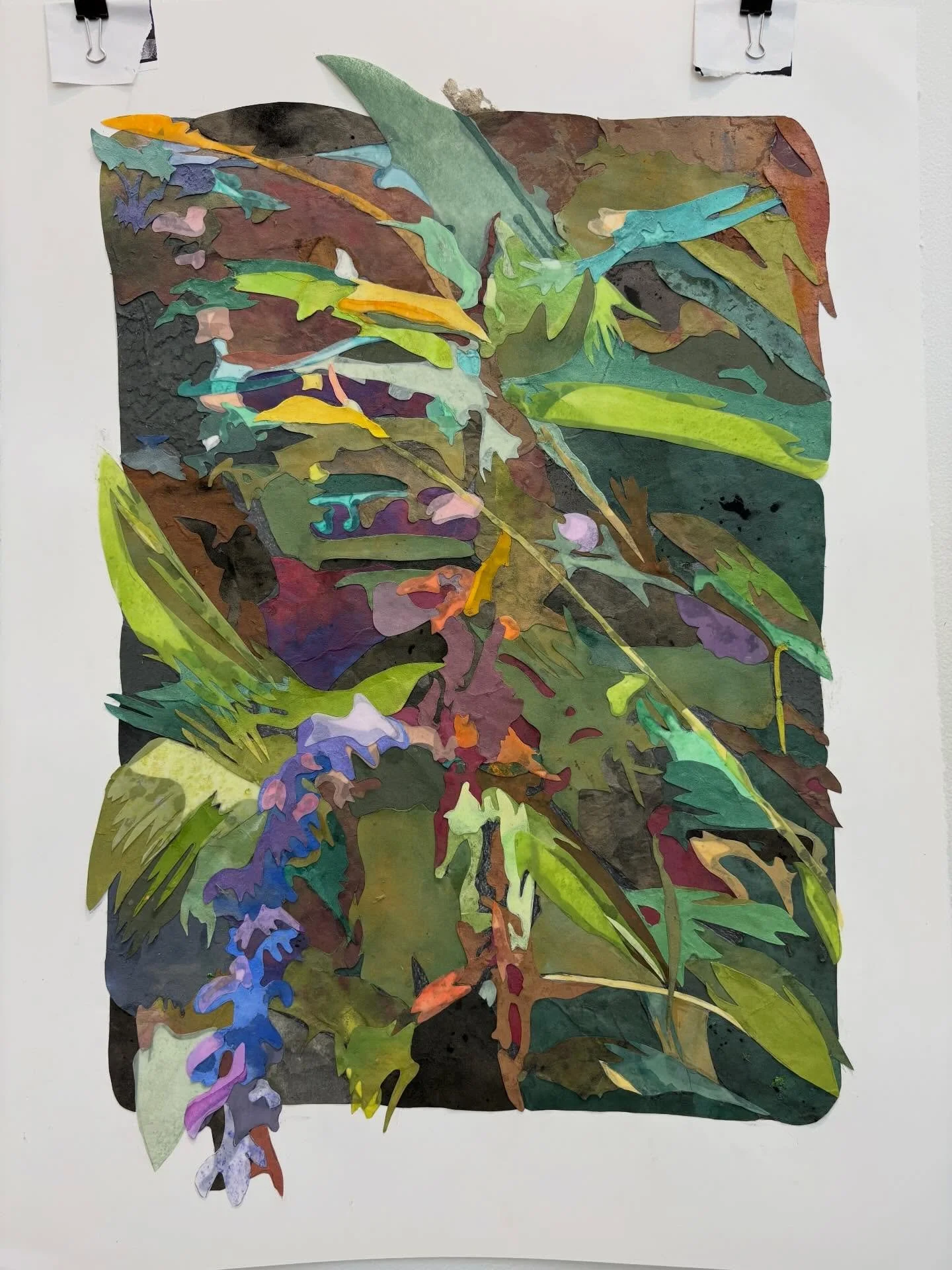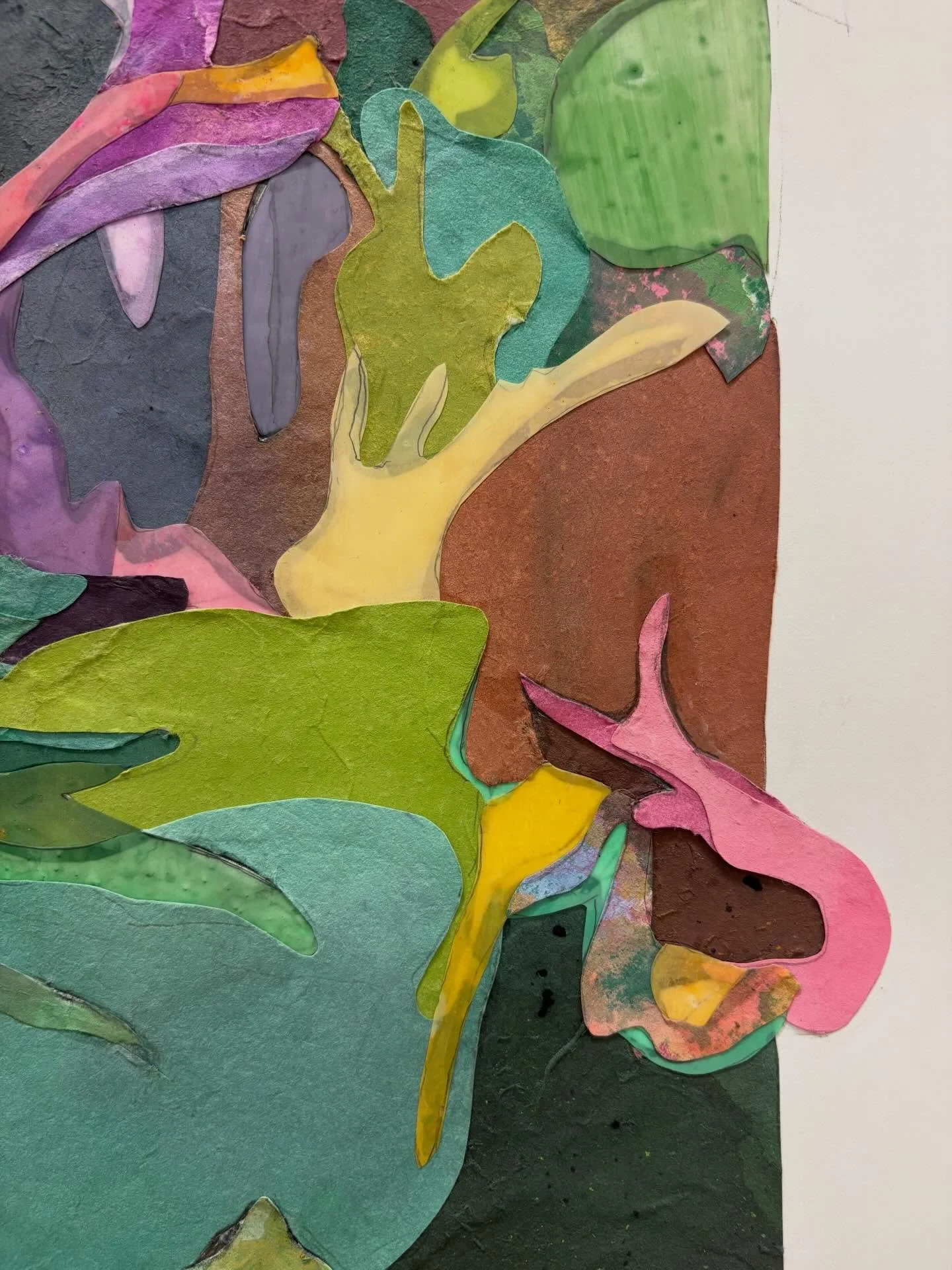 Each piece I make begins with a photograph: an artifact from the real world, a stand-in for what “is”—light and shadow captured by a mechanical lens. After applying digital filters to manipulate color and draw out interesting shapes, I translate the resulting imagery using self-taught methods, the illusion of space emerging slowly over a period of time. By leaving evidence of the labor that created it, I want to infuse that which may be too subtle or quiet to be seen with an aura of presence. Collage is a language for the disenfranchised to imagine new worlds which include them; re-pulping celebrates the decorative, the feminine, metaphors for the overlooked: the marginalized, the introverted. It celebrates the poetry of everyday life.