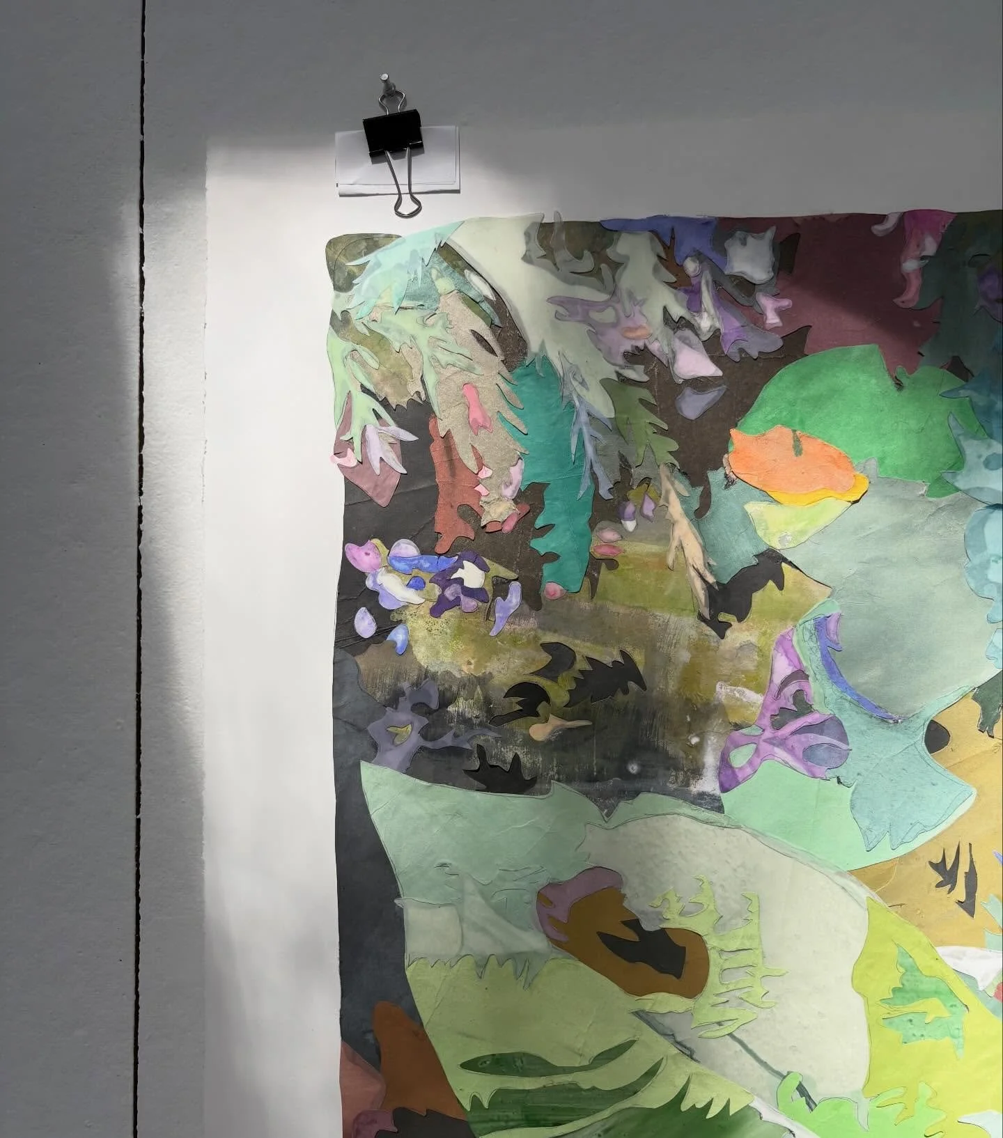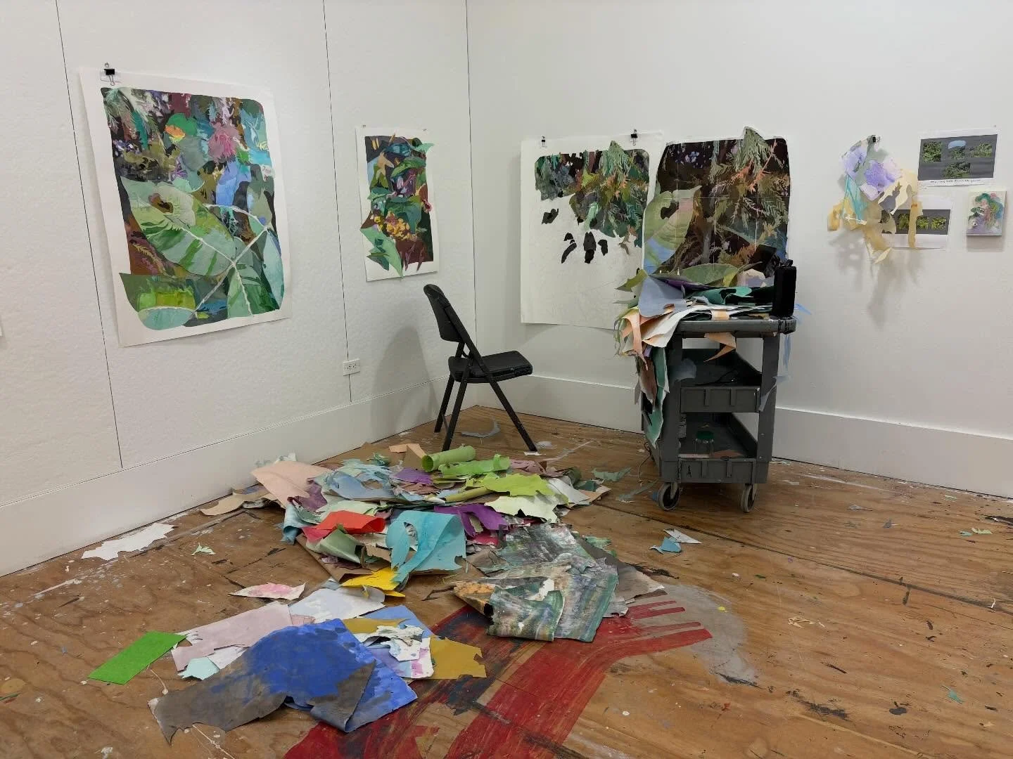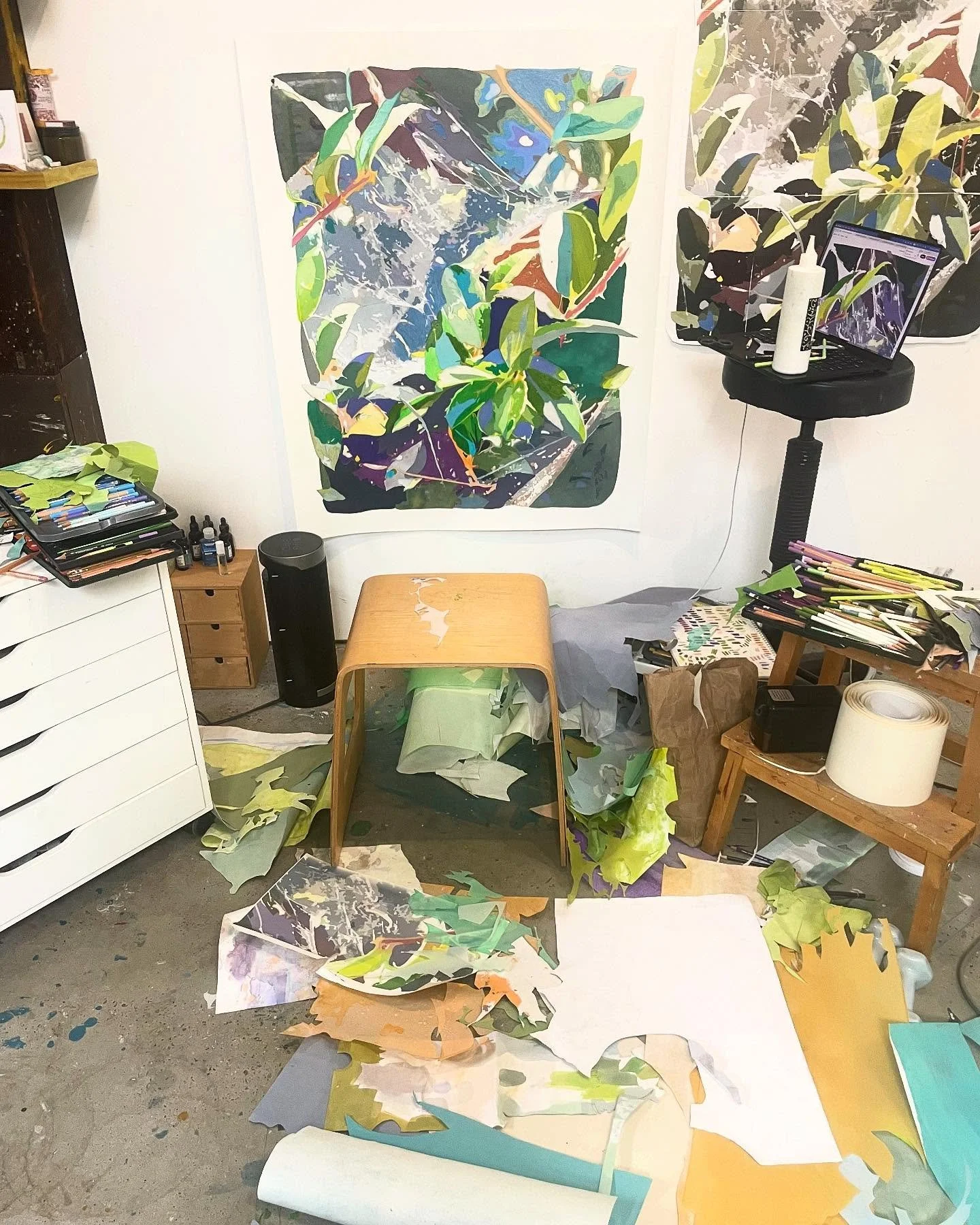 Each piece I make begins with a photograph: an artifact from the real world, a stand-in for what “is”—light and shadow captured by a mechanical lens. After applying digital filters to manipulate color and draw out interesting shapes, I translate the resulting imagery using self-taught methods, the illusion of space emerging slowly over a period of time. By leaving evidence of the labor that created it, I want to infuse that which may be too subtle or quiet to be seen with an aura of presence. Collage is a language for the disenfranchised to imagine new worlds which include them; re-pulping celebrates the decorative, the feminine, metaphors for the overlooked: the marginalized, the introverted. It celebrates the poetry of everyday life.